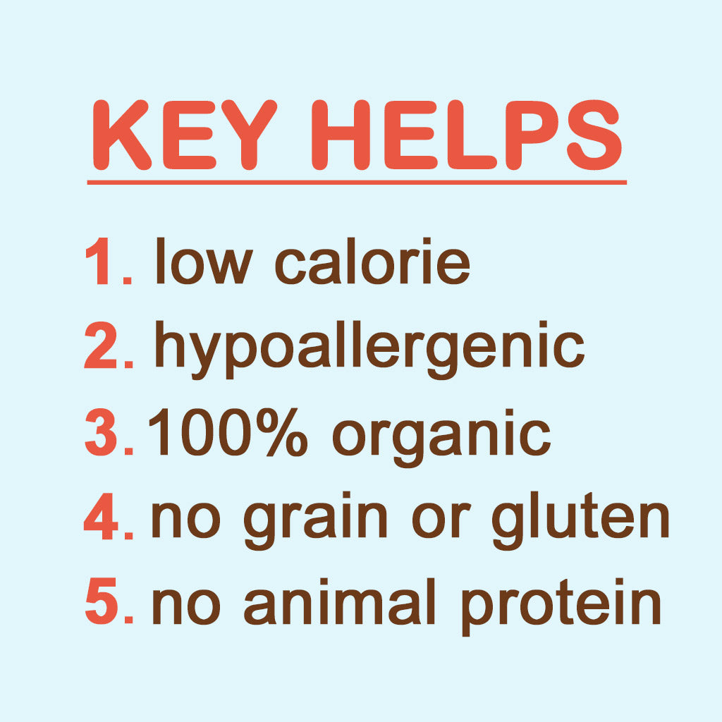 - No animal protein. Excellent for dogs on a limited protein diet or single source protein diet (ie: dogs with kidney, liver issues, or allergies).